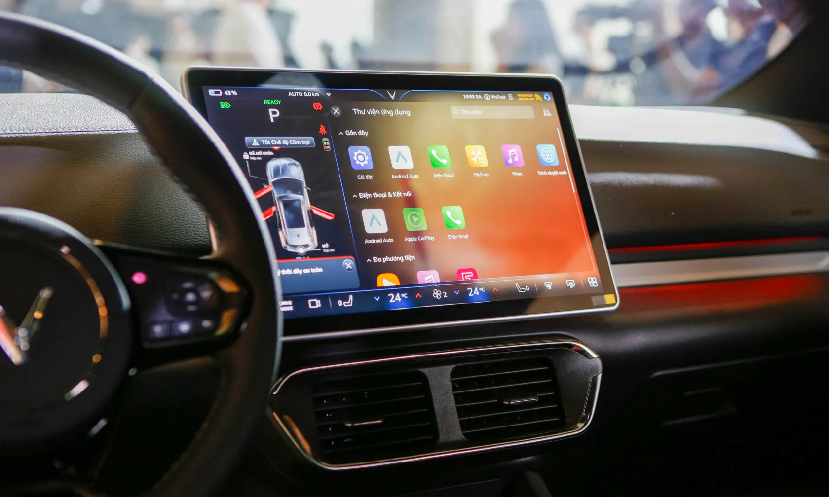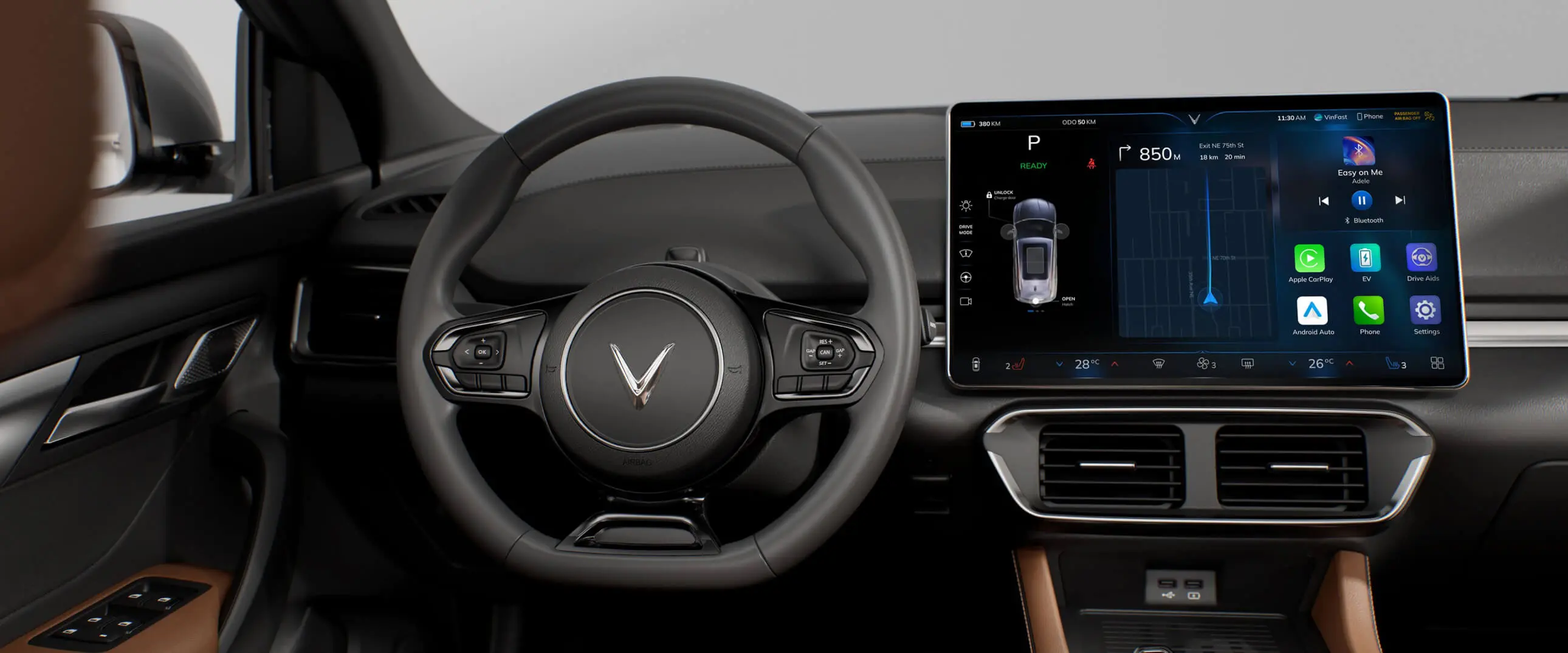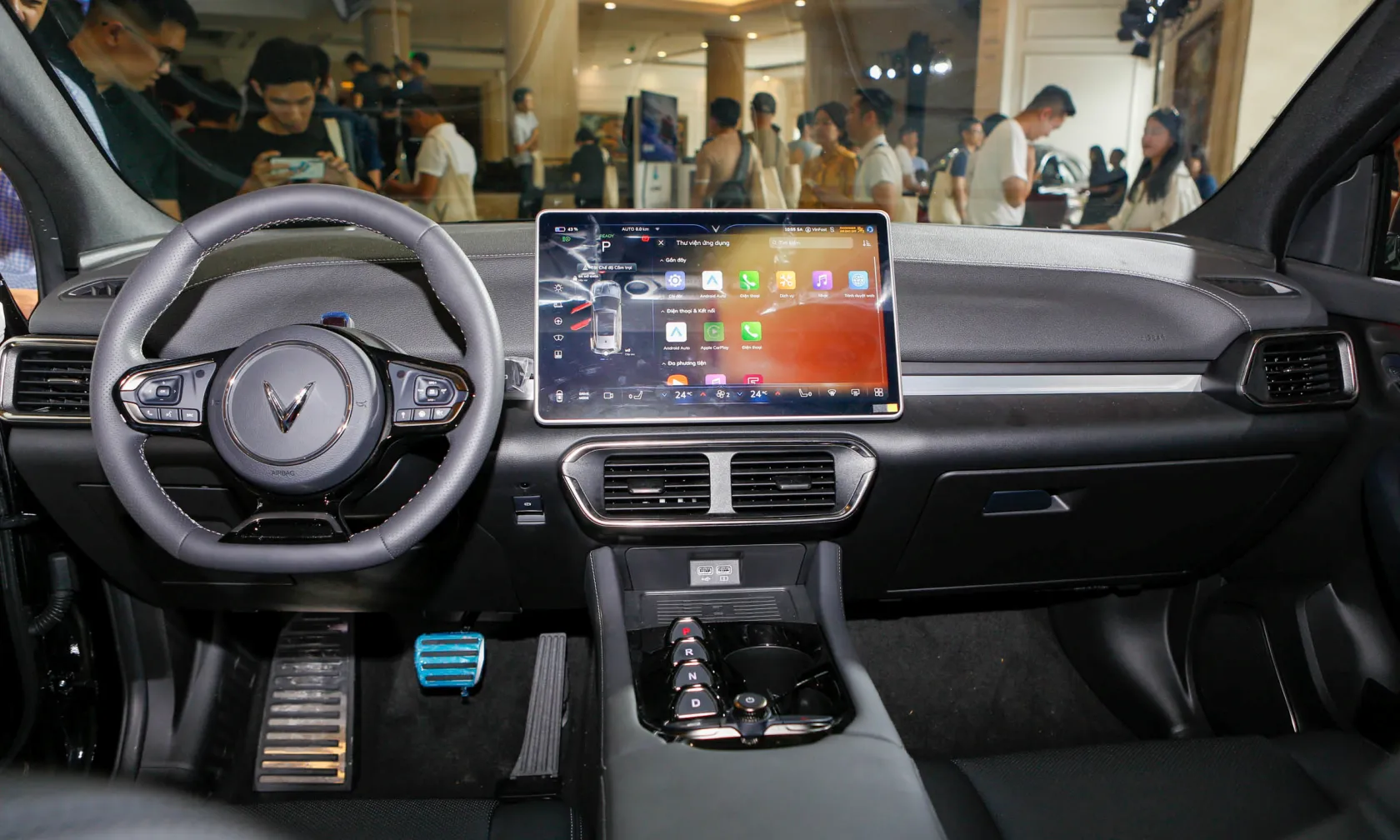 Cần số dạng nút bấm. Bệ tỳ tay kích thước lớn có thể trở thành bàn làm việc khi cần. Hệ thống đèn viền nội thất không chỉ mang đến cảm giác dễ chịu cho người ngồi, mà còn tăng thêm tính sang trọng cho mẫu xe điện nguồn gốc Việt Nam.