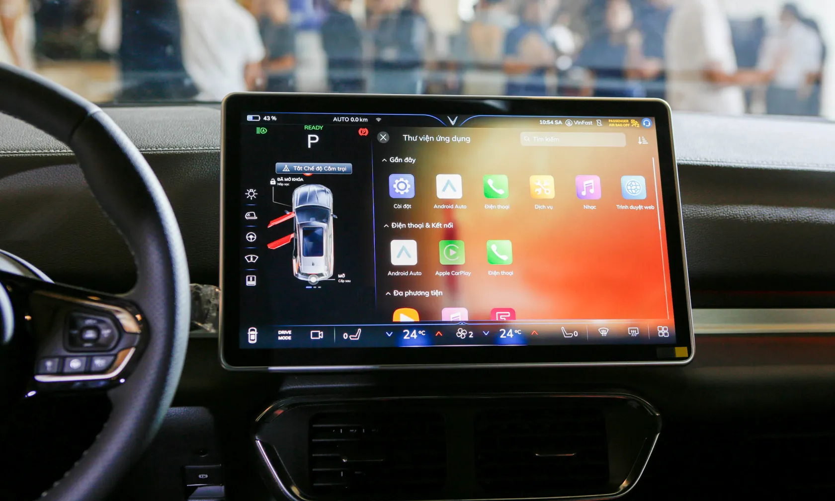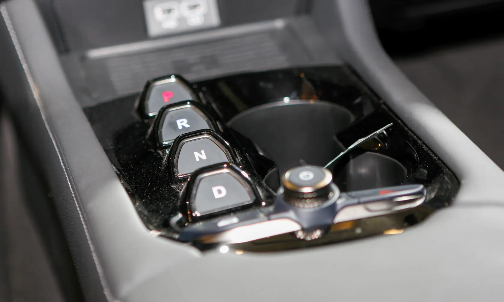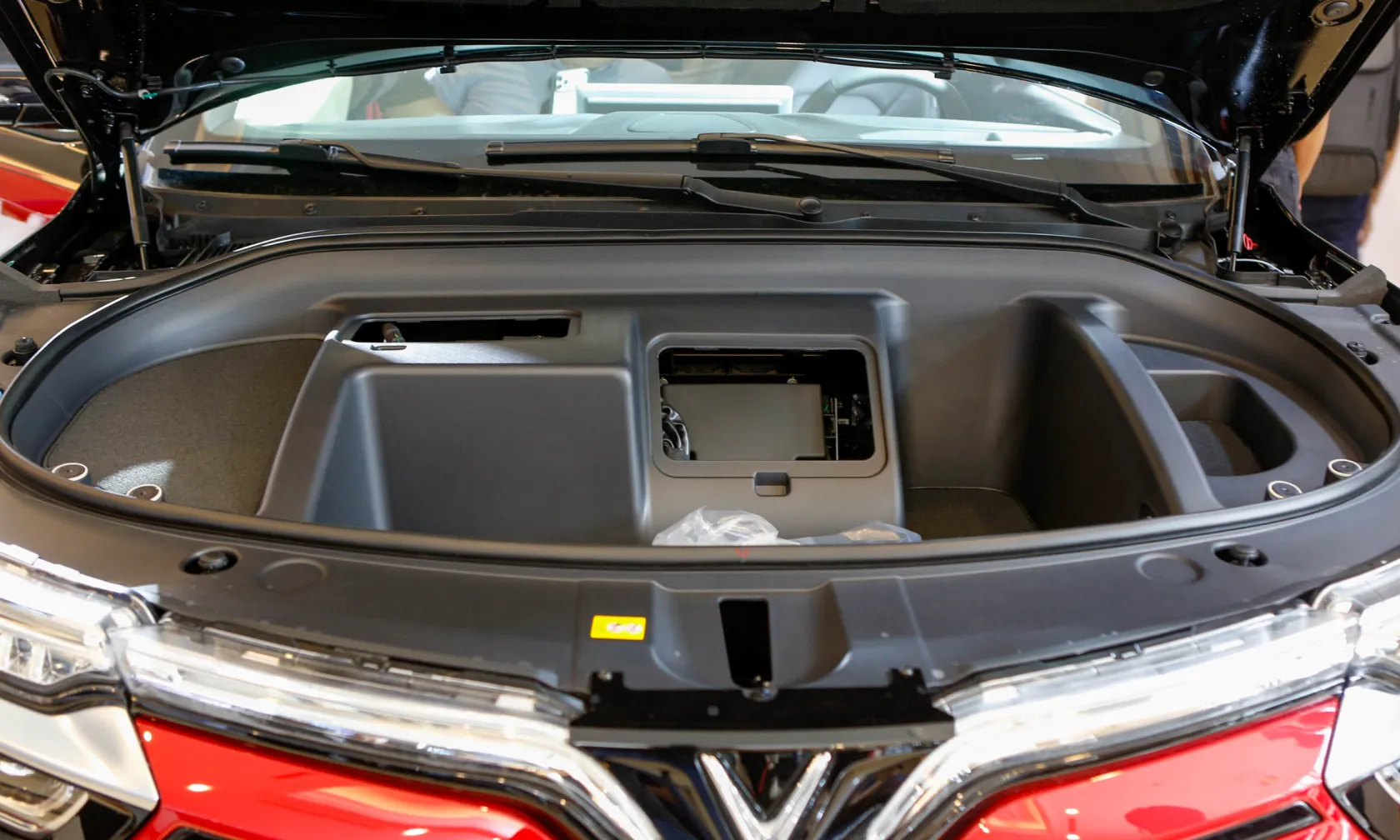 Cần số dạng nút bấm. Bệ tỳ tay kích thước lớn có thể trở thành bàn làm việc khi cần. Hệ thống đèn viền nội thất không chỉ mang đến cảm giác dễ chịu cho người ngồi, mà còn tăng thêm tính sang trọng cho mẫu xe điện nguồn gốc Việt Nam.
