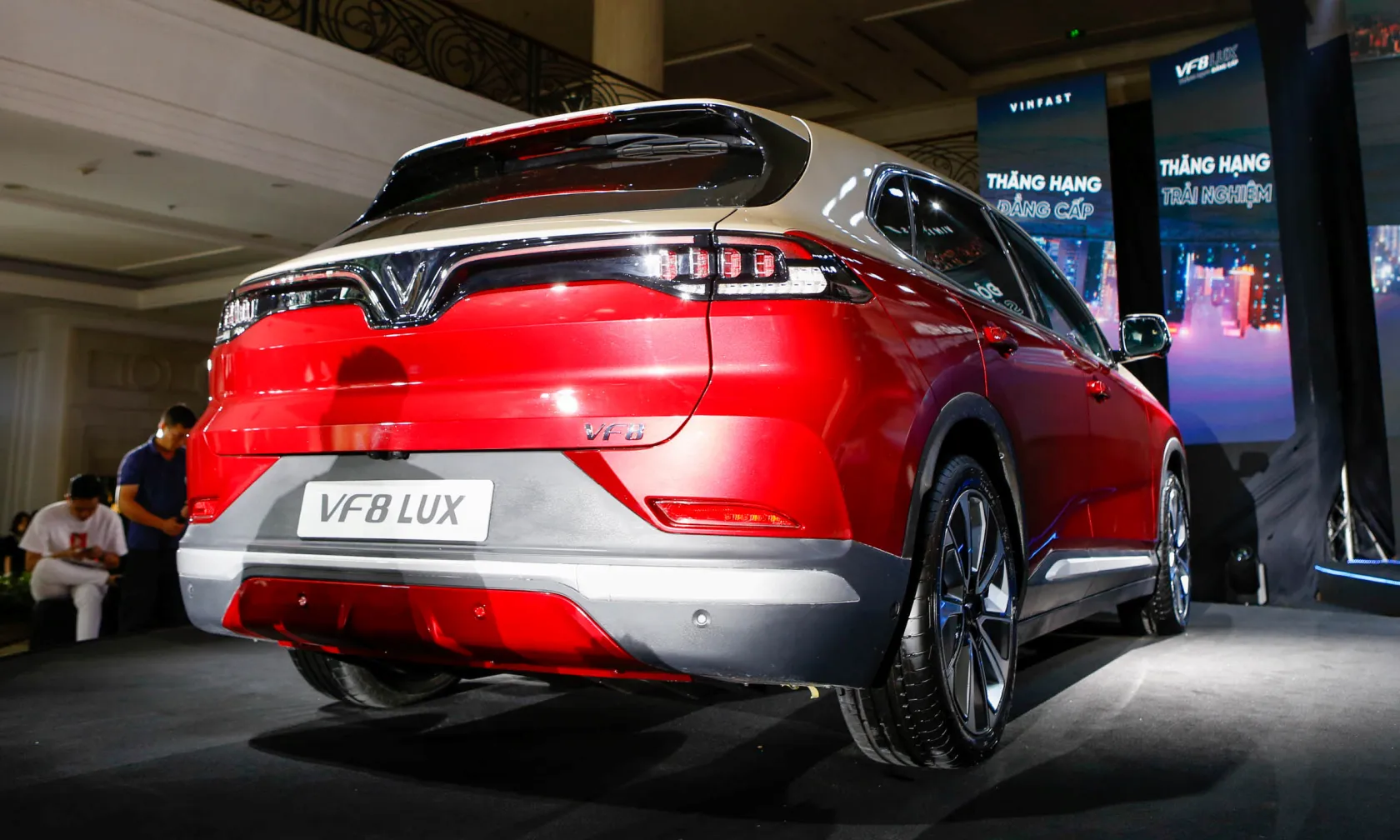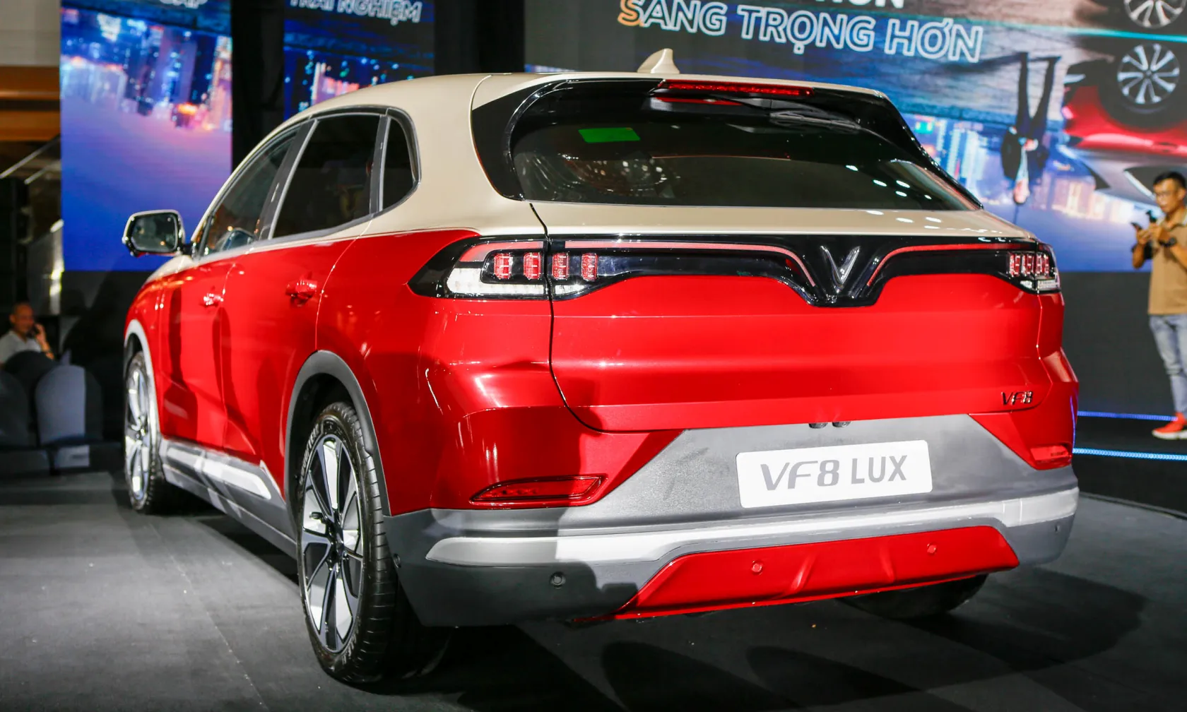 Đuôi xe VinFast VF 8 với những đường nét thiết kế cứng cáp, nhấn mạnh sự khỏe khoắn thường thấy trên một mẫu SUV-D. T