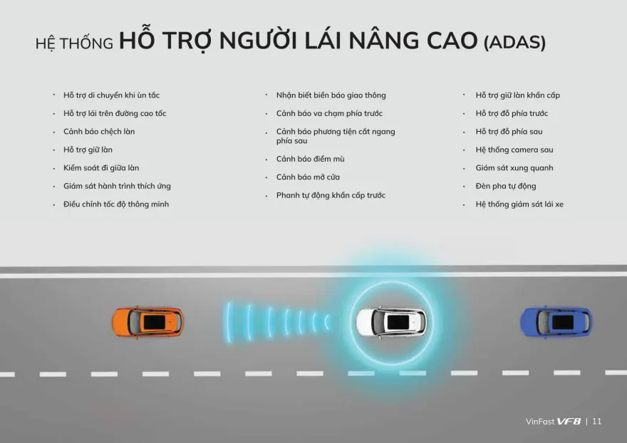 ADAS - Công nghệ hỗ trợ lái xe thông minh, an toàn đã được VinFast trang bị trên các dòng xe xăng và xe điện VinFast VF e34, có thể kể đến các tính năng như: giám sát hành trình thích ứng, hệ thống giám sát xung quanh 360 độ, cảnh báo điểm mù,...