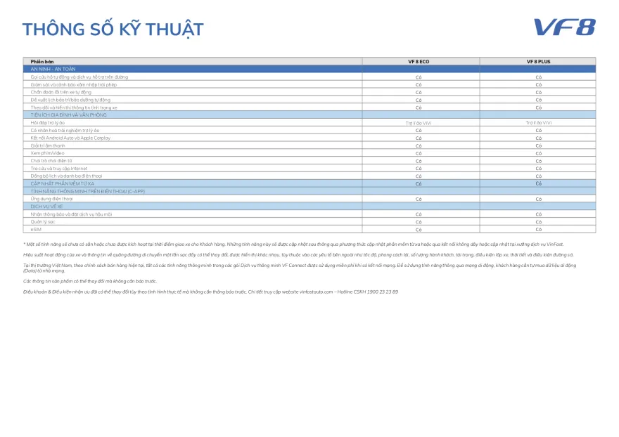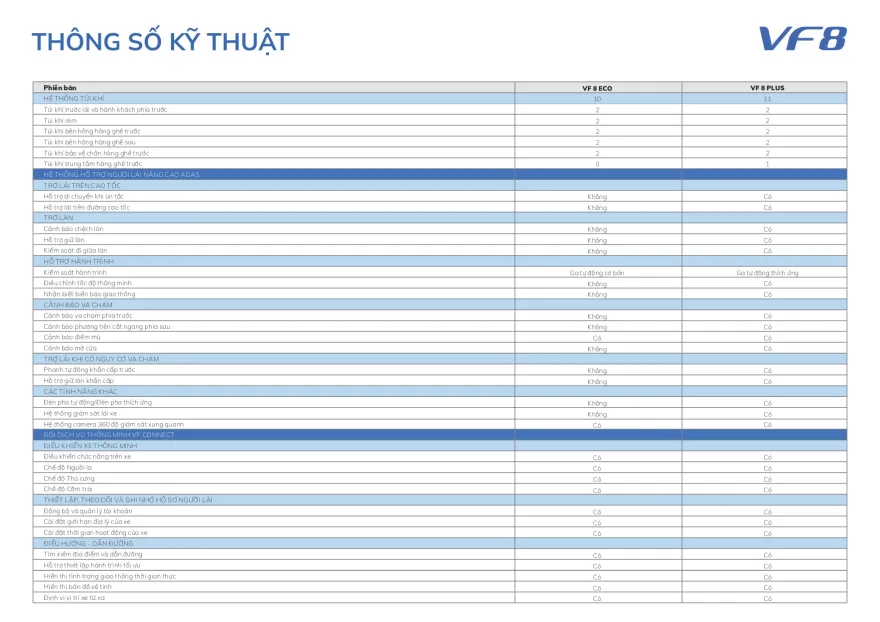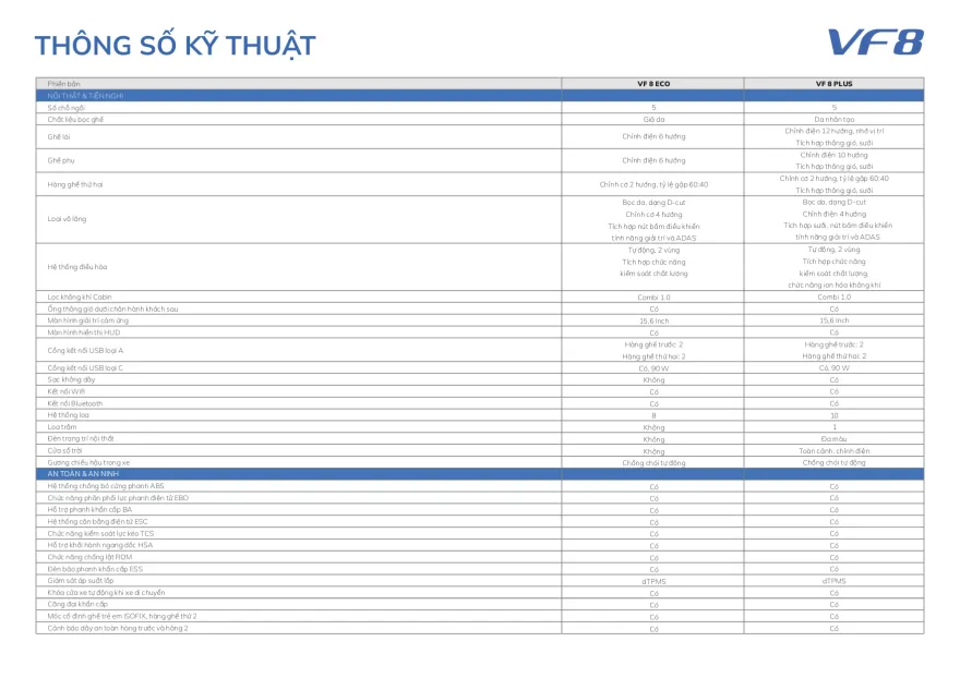 Thương hiệu Việt kỳ vọng rằng với danh sách an toàn và công nghệ hỗ trợ lái tiên tiến mà VF8 đang sở hữu. Mẫu SUV này sẽ có thể đạt tiêu chuẩn 5 sao ASEAN NCAP, 5 sao EURO NCAP và 5 sao NHTSA.