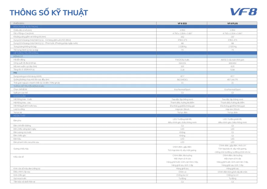 Theo công bố từ nhà sản xuất, VF8 có thể chạy được 400 – 420 km cho mỗi lần sạc đầy. Thời gian tăng tốc từ 0-100 km/h của xe là 5,5 giây.